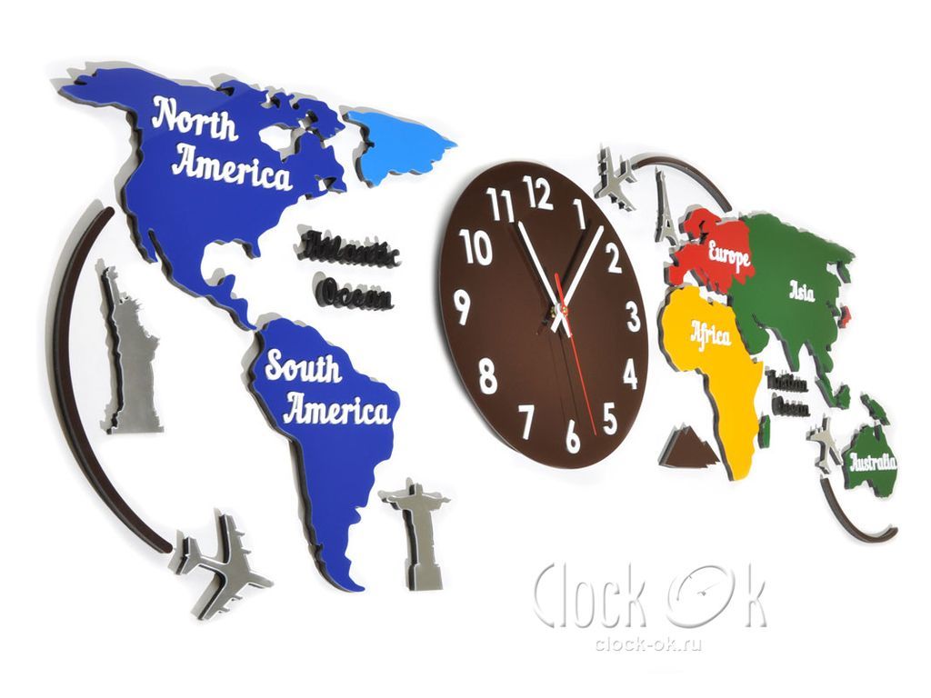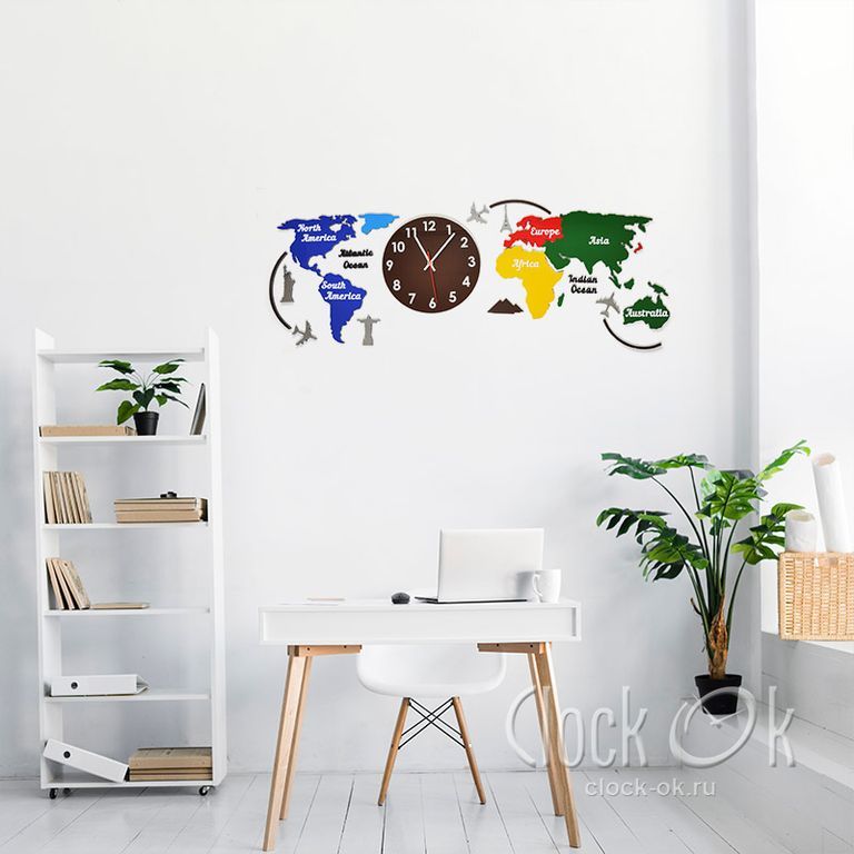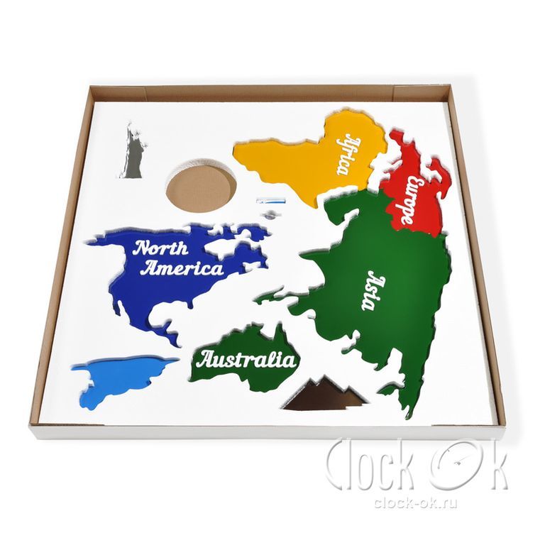 Изделение представляет собой разноцветную карту мира на специальной вспененной основе. В центре композиции находятся часы.