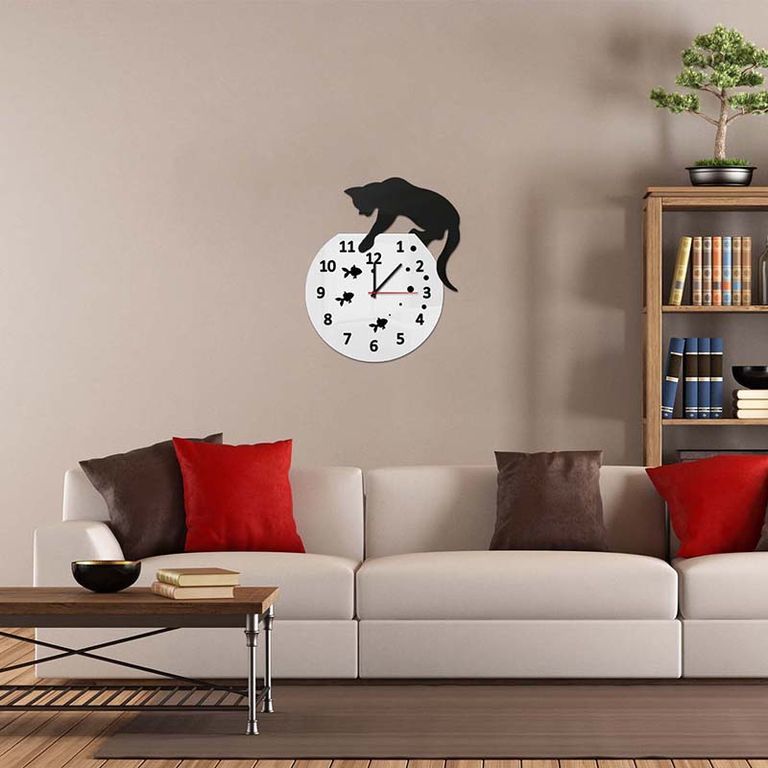 Как известно, кошка - символ домашнего тепла и уюта. Настенные часы с изображением котов очень популярны, такие часы-стикеры можно наклеить на любую поверхность. Выполненные из высококачественного акрилового пластика, они имеют отражающую зеркальную поверхность, что делает их подходящими к любой цветовой гамме интерьера. А также такие настенне часы в виде кошки придадут шарма и нотку игривости Вашей комнате.
